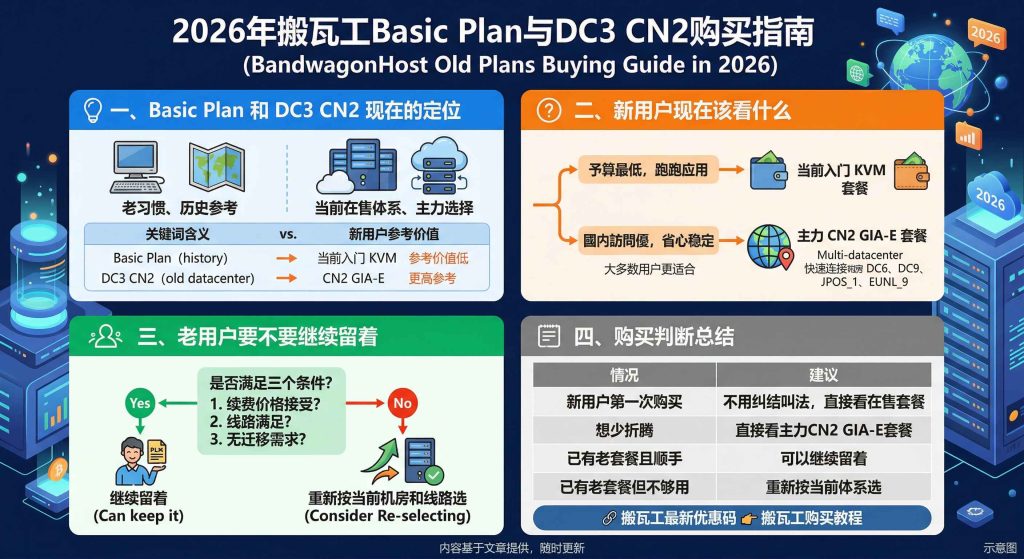 很多人现在还会搜 搬瓦工 Basic Plan 或 DC3 CN2,但先说结论,这两个词放到 2026 年,更多还是老文章、老套餐留下来的搜索习惯。新用户如果是第一次买搬瓦工,重点不用再卡在这两个旧名字上,直接看当前在售的入门套餐和能迁移机房的主力套餐就可以。